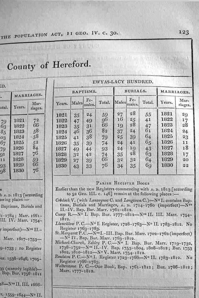 Ewyas Lacy Hundred Parish Registers Abstract 1821-1830: baptisms, burials, marriages