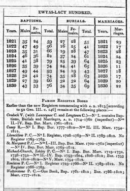 Schedule of Baptisms, Burials and Marriages for the years 1821 to 1830 and extant Parish Register Books.