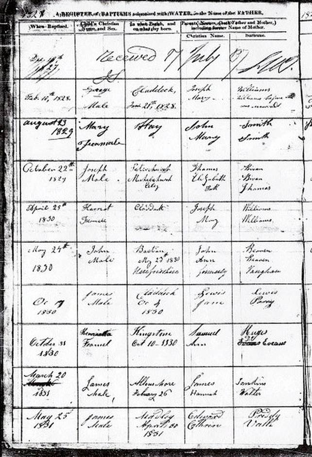 Photograph of a Register of Births and Baptisms from 1828 to 1837, which was surrendered to the Non-parochial Registers Commissions of 1837 and 1857 by the Cwm Primitive Methodist Circuit in the Parish of Cwm, Herefordshire.