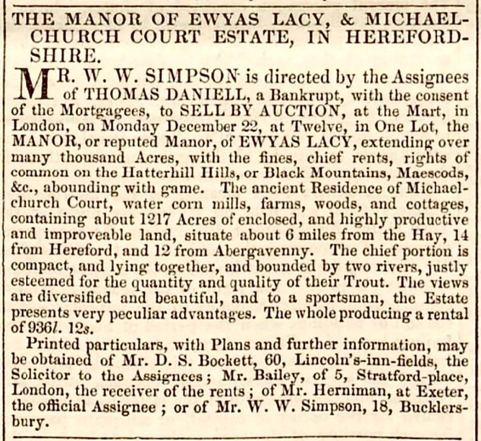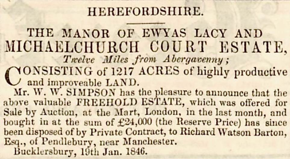 When Richard Watson Barton, Esq, of Manchester became Lord of the Manor of Ewyas Lacy, local people could have been forgiven for assuming that another absentee landlord would have little impact on a area that had slumbered as a quiet rural backwater for generations. However, all that began to change on 22nd December 1845, when the Manor of Ewyas Lacy including the Michaelchurch Estate was put up for auction in London by the Assignees of Thomas Daniell, the then Lord of the Manor of Ewyas Lacy, who had been declared bankrupt. The Manor at that time was claimed to produce rental income of £936.12s. per annum and to consist of 1217 acres of enclosed and highly productive land together with rights over many thousands of acres of commons.