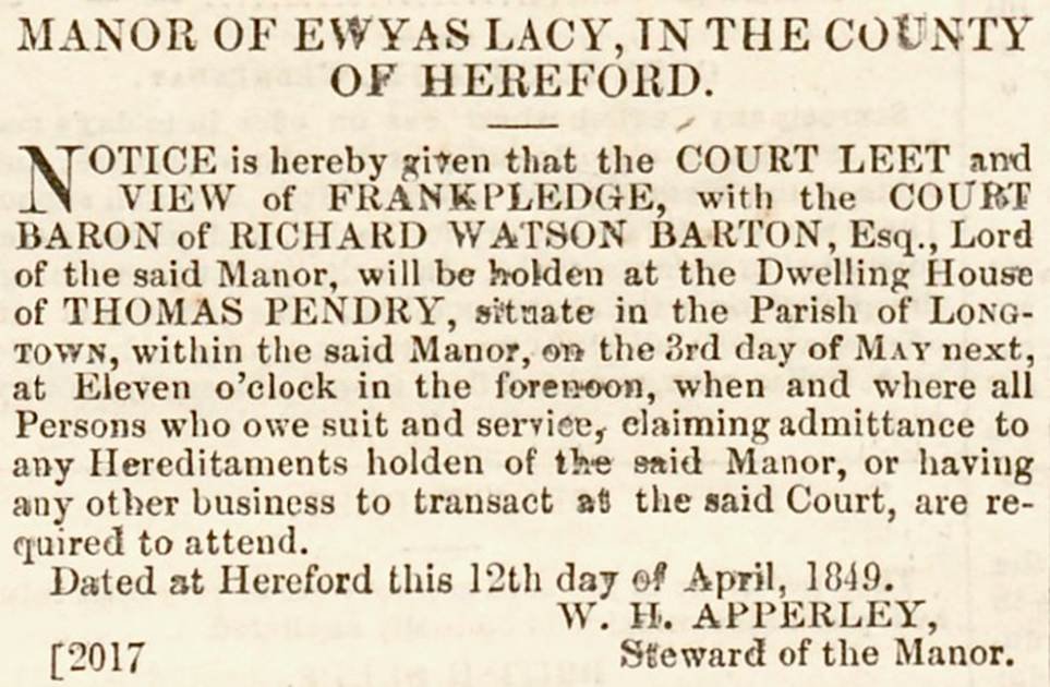 Barton appointed WH Apperley of Hereford to be Steward of the Manor, and notice was given on 12th April 1849 that the Court Leet and View of Frankpledge, with the Court Baron of Richard Watson Barton, Lord of the Manor of Ewyas Lacy would be held on 3rd of May.