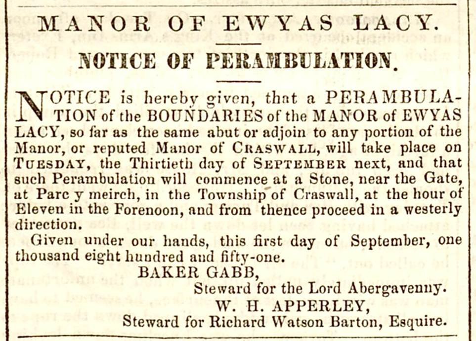 In further exercise of his rights Barton, through Steward Apperley, issued on 1st September 1851 a notice of Perambulation of Boundaries of the Manor of Ewyas Lacy. The Perambulation was to take place on Tuesday 30th September, commencing at a stone near the Gate at Parc y meirch in the township of Craswall at the hour of eleven in the forenoon and proceeding in a westerly direction. Interestingly, the notice was issued jointly by Apperley as Steward for Barton and by Baker Gabb as Steward for Lord Abergavenny, indicating that both principals regarded themselves as Lord of a moiety of the Manor, an arrangement dating back to the split of the Lordship in Norman times.