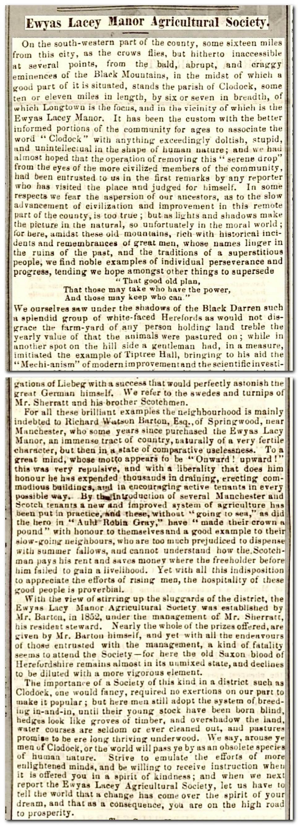 In 1856 Richard Barton’s progressive activities as Lord of the Manor attracted sufficient attention to merit an article in a local newspaper about his establishment of the Ewyas Lacy Manor Agricultural Society. After some rude remarks about the traditionally doltish nature of the people of Clodock the reporter noted a splendid herd of white-faced Hereford cattle grazing under the shadow of the Black Darren and crops of swedes and turnips being raised on a nearby hillside. Credit for these examples of agricultural improvements was attributed to Richard Barton of Springwood near Manchester who had transformed the Ewyas Lacy Manor from a ‘state of comparative uselessness’ by spending thousands in draining, erecting commodious buildings and in encouraging active tenants in every possible way. The article asserts that by introducing several Manchester and Scotch tenants a new and improved system of agriculture has been put into practice which has set a good example to their ‘slow-going neighbours’ who are stuck in their old ways and cannot understand how the new tenants pay their rent and save money where previous freeholders of the same land failed to gain a livelihood.