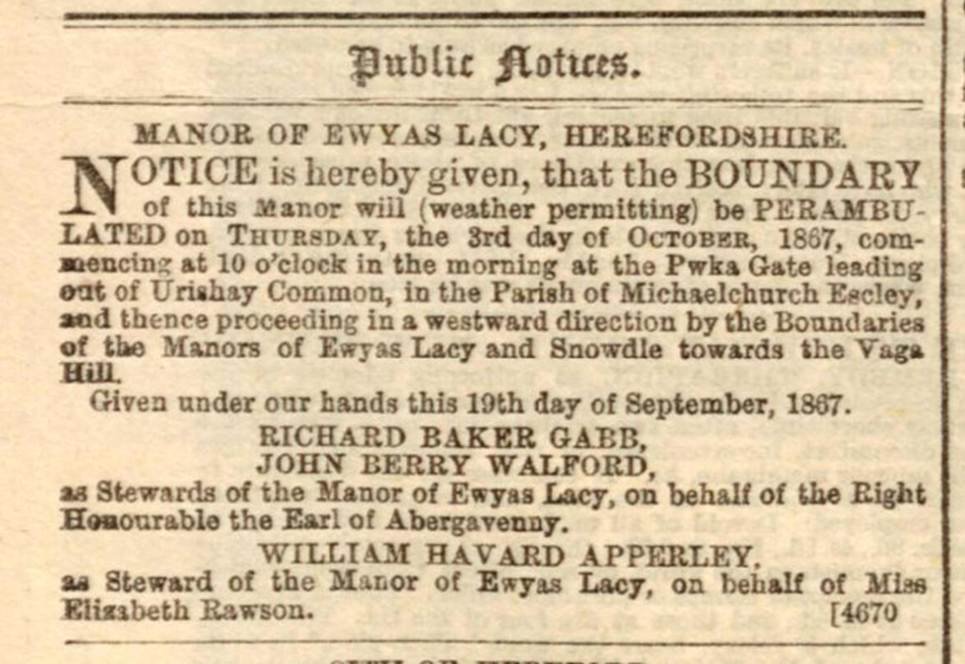 Notice of a further Perambulation of the Manor was subsequently issued on 19th September 1867 by the stewards of The Earl of Abergavenny and Miss Elizabeth Rawson, to take place on 3rd October at 10 o’clock in the morning. On this occasion it was to start at the Pwka Gate leading out of Urishay Common and proceeding westward by the boundaries of the Manors of Ewyas Lacy and Snowdle towards the Vaga Hill.