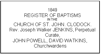 1849 REGISTER OF BAPTISMS IN THE CHURCH OF ST. JOHN. CLODOCK. Rev. Joseph Walker JENKINS, Perpetual Curate, JOHN POWELL, DAVID WATKINS, Churchwardens |